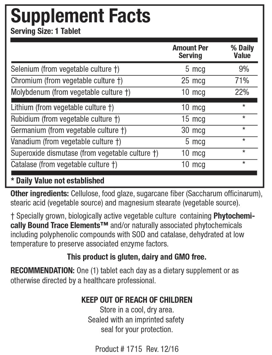 Selenium (raw vegetable culture†), Chromium (raw vegetable culture†), Molybdenum (raw vegetable culture†), Lithium (raw vegetable culture†), Rubidium (raw vegetable culture†), Germanium (raw vegetable culture†), Vanadium (raw vegetable culture†), Superoxide Dismutase (raw vegetable culture†) & Catalase (raw organic vegetable culture†). †Specially grown, biologically active vegetable culture containing Phytochemically Bound Trace Elements™ and/or naturally associated phytochemicals including polyphenolic compounds with SOD and catalase, dehydrated at low temperature to preserve associated enzyme factors. Cellulose, food glaze, sugarcane fiber (Saccharum officinarum), stearic acid (vegetable source) and magnesium stearate (vegetable source).This product is gluten, dairy and GMO free.