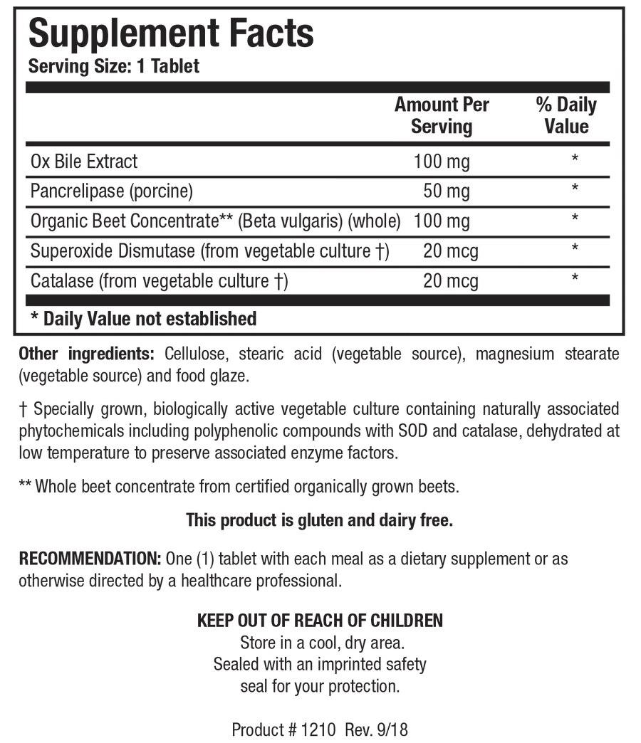 Ox Bile Extract, Pancrelipase (porcine), Organic beet concentrate** (Beta vulgaris) (whole), Superoxide dismutase (raw organic vegetable culture†), Catalase (raw organic vegetable culture†).