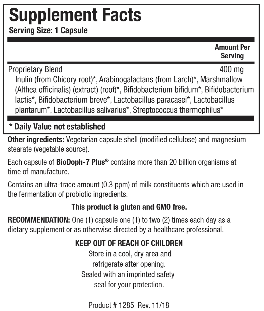 Probiotics are classically defined as "a preparation of, or a product containing viable, defined microorganisms in sufficient numbers, which alter the microbiota (typically by colonization) in a compartment of the host, and by that, exert beneficial health effects in this host". In humans the organ considered to be the most diverse and the most metabolically active is the gastrointestinal tract. An integral part of an optimally functioning gastrointestinal tract is the microbial community. BioDoph-7 Plus® supplies a blend of pro- and prebiotics, including Bifidobacterium bifidum, Bifidobacterium lactis, Bifidobacterium breve, Lactobacillus paracasei, Lactobacillus plantarum, Lactobacillus salvarius, and Streptococcus thermophilus, along with the prebiotics Inulin (from chicory root), Arabinogalactans (from Larch), and Marshmallow root (extract).