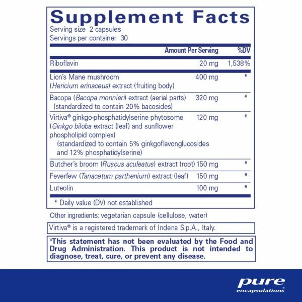 Brain Reset is designed to promote concentration and memory with multi-faceted support for healthy blood flow, immune mediator production, neuroprotection, and cognitive function. Ginkgo biloba and butcher's broom help sustain the strength and elasticity of blood vessels and capillaries, and may also promote the flow of oxygen and blood to the brain. Ginkgo biloba is included in this formula as Virtiva® ginkgo-phosphatidylserine phytosome complex. Phytosomes boost resistance to degradation in the digestive tract and promote efficient absorption across membranes for enhanced bioavailability. In a randomized, double-blind, placebo-controlled crossover study, phosphatidylserine-bound ginkgo extract enhanced secondary memory performance and significantly increased speed of memory task performance at 1, 2.5, 4 and 6 hours, compared to standard ginkgo extract or phosphatidylcholine-bound ginkgo extract. In another study, ginkgo extract promoted executive function in women. Preliminary research suggests that ginkgo may also support dopamine levels in the prefrontal cortex of the brain. Bacopa extract has over 35 years of clinical research focusing on support for memory and peak cognitive performance. In a randomized, controlled trial involving healthy adults, 320 mg of bacopa extract promoted performance on cognitively demanding tests. In another study, it promoted multi-tasking performance at 1 and 2 hours after administration, and supported positive mood. In a third trial, 90 days of supplementation with Bacopa promoted working memory performance, including spatial working memory accuracy and visual information processing accuracy. Riboflavin and feverfew have been studied for their ability to promote cranial comfort, with numerous randomized, double-blind, placebo-controlled trials exploring their supportive effects. Feverfew is thought to act in part by maintaining healthy cytokine, leukotriene and prostaglandin metabolism, as well as promoting healthy cranial vascular muscle function. Luteolin promotes neuronal health through antioxidant, immunomodulating, and mast cell stabilizing actions, helping to moderate the release of immune mediators. In a randomized, double-blind trial involving older men and women, daily supplementation with 3.2 grams of lion's' mane powder (equivalent to 800 mg of Lion's mane 30% polysaccharides extract) daily for 12 weeks promoted cognitive function, as assessed by the Mini mental state examination questionnaire (MMSE). It may also offer support for relaxation and mood. In vitro and animal research suggest that lion's mane promotes neuronal health by supporting nerve growth factor (NGF) synthesis.