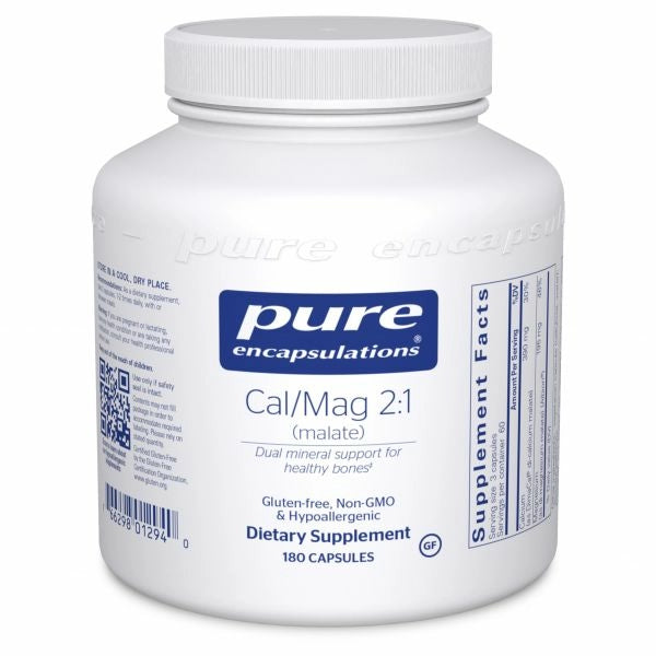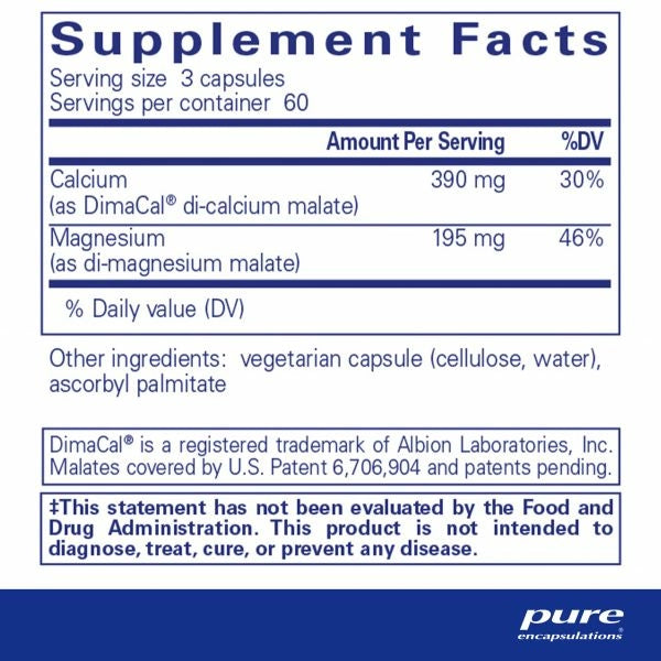 Combines di-calcium malate and di-magnesium malate for the highest elemental calcium and magnesium per capsule. These minerals are chelated with the krebs cycle intermediate malate for optimal absorption. Randomized, double-blind, placebo-controlled studies have reported statistically significant benefits of calcium supplementation for bone health Magnesium, like calcium, is an essential bone matrix mineral that promotes healthy bone metabolism. A trial involving 2,038 older individuals indicated that higher intakes of magnesium were positively associated with bone mineralization for certain individuals. Supplementation with calcium and magnesium provides synergistic support for bone health. Magnesium supports cardiovascular health by helping to maintain healthy levels of cellular and plasma electrolytes, including calcium and potassium. Additionally, calcium and magnesium may help to promote healthy lipid metabolism.