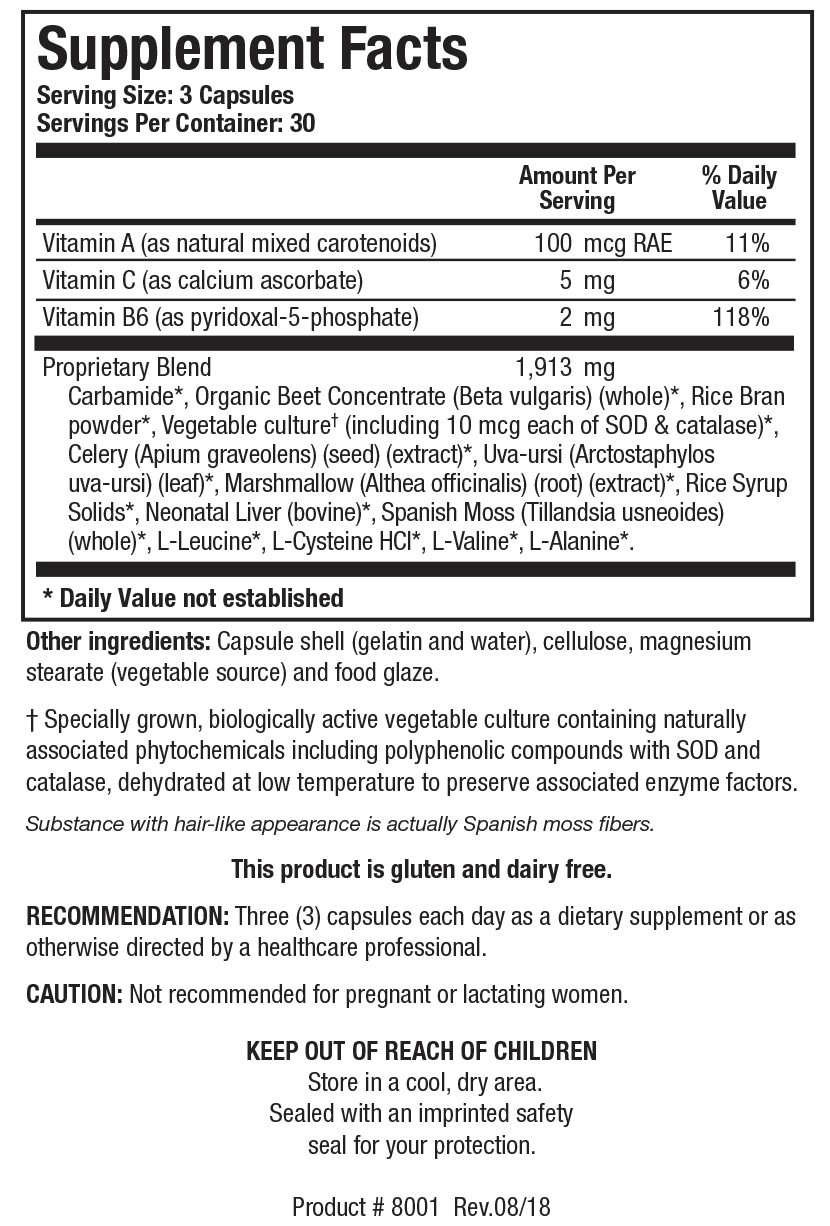 Vitamin A (as natural mixed carotenoids), Vitamin C (as calcium ascorbate), Vitamin B6 (as pyridoxal-5-phosphate), Carbamide, Organic Beet Concentrate (Beta vulgaris) (whole), Rice Bran powder, Vegetable culture† (including 10 mcg each of SOD & catalase), Celery (Apium graveolens) (seed) (extract), Uva-ursi (Arctostaphylos uva-ursi) (leaf), Marshmallow (Althea officinalis) (root) (extract), Rice Syrup Solids, Neonatal Liver (bovine), Spanish Moss (Tillandsia usneoides) (whole), L-Leucine, L-Cysteine HCl, L-Valine, L-Alanine.