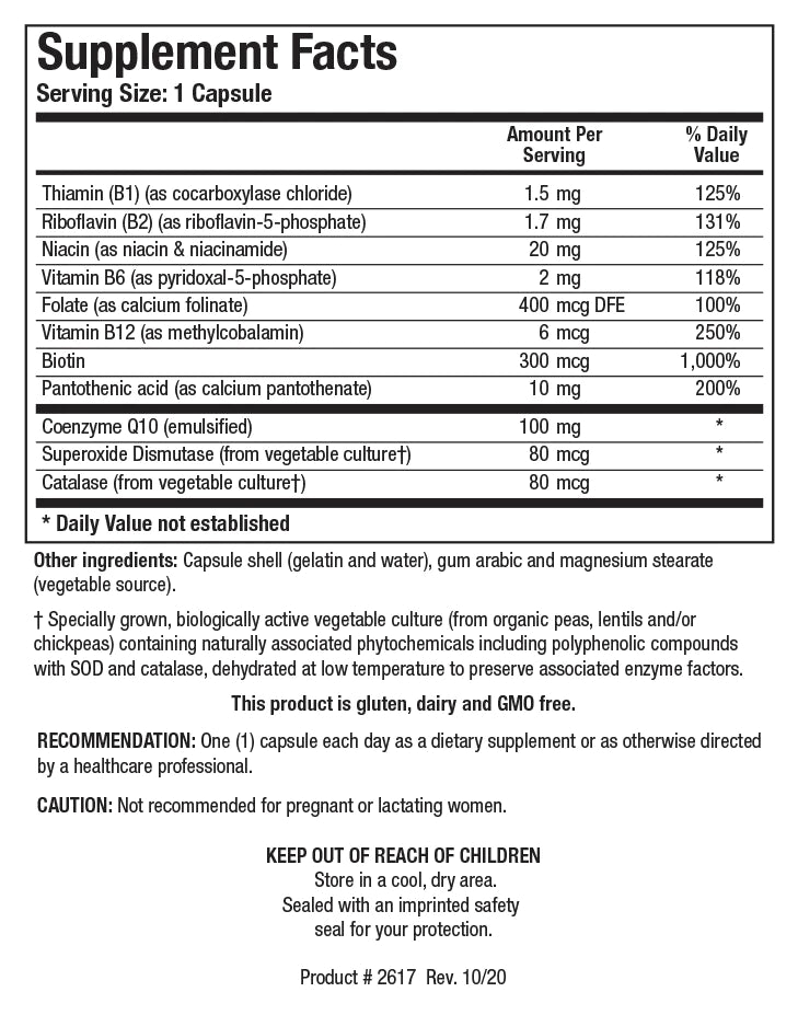Thiamin (B1) (as cocarboxylase chloride); Riboflavin (B2) (as riboflavin-5-phosphate); Niacin (as niacin & niacinamide); Vitamin B6 (as pyridoxal-5-phosphate); Folate (as calcium folinate); Vitamin B12 (as methylcobalamin); Biotin; Pantothenic acid (as calcium pantothenate); Coenzyme Q10 (emulsified); Superoxide Dismutase (from vegetable culture†); Catalase (from vegetable culture†)