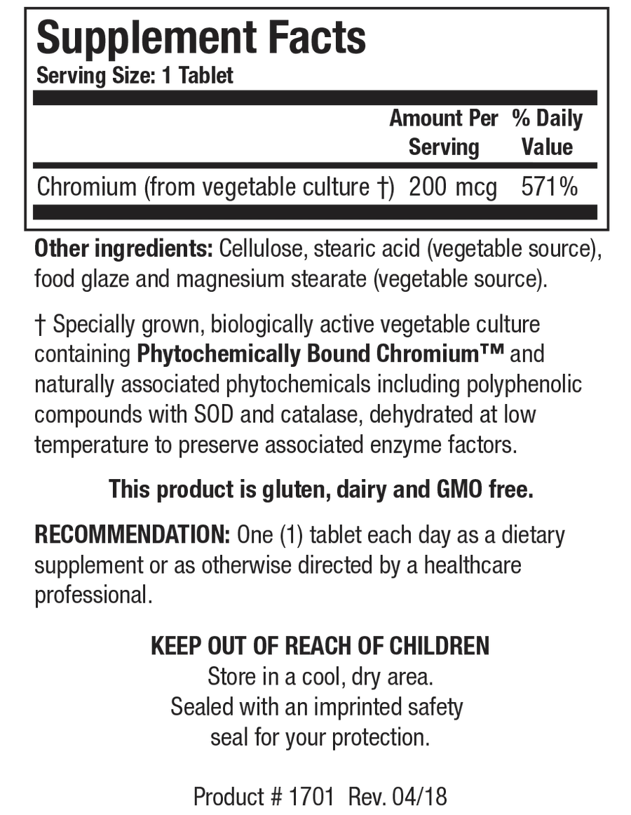 Chromium (from vegetable culture †) †Specially grown, biologically active vegetable culture containing Phytochemically Bound Chromium™ and naturally associated phytochemicals including polyphenolic compounds with SOD and catalase, dehydrated at low temperature to preserve associated enzyme factors.