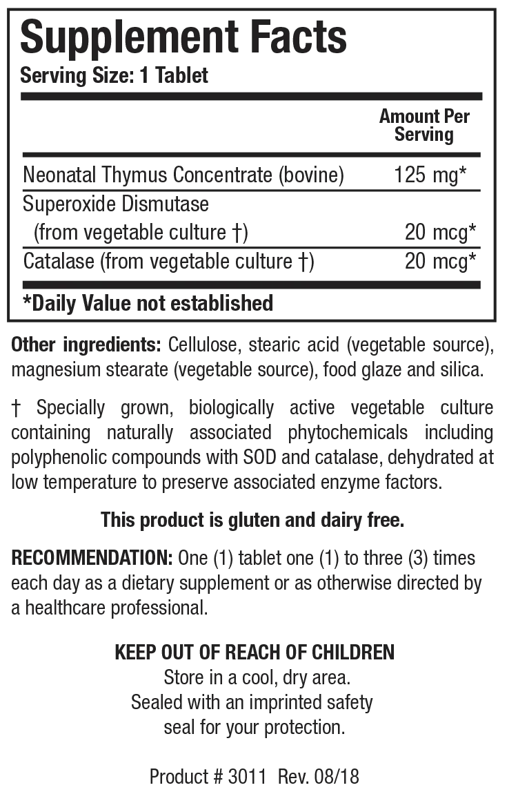 Neonatal Thymus Concentrate (bovine), Superoxide Dismutase (from vegetable culture†), Catalase (from vegetable culture†).