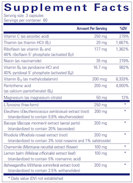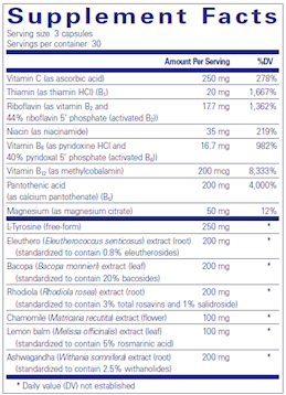 In addition to promoting memory and cognitive function, preclinical investigation shows Bacopa monnieri maintains healthy enzyme activity in the brain , supporting the ability to deal with stress. A double-blind crossover trial suggested that rhodiola may help to moderate mild fatigue under stressful conditions. In a separate, double-blind, placebo-controlled pilot study, rhodiola provided support for physical and mental stress in students. Similarly, the amino acid l-tyrosine has indicated the potential to promote cognitive function and memory under stressful conditions. Eleutherococcus senticosus, or eleuthero, is used as an adaptogen to help bolster adrenal function and stress resistance. Like ashwagandha, it is highly revered for promoting energy, vitality and immune defense. Chamomile and lemon balm provide traditional support for calmness and relaxation. B vitamins and magnesium are included to help counter the effects of stress on healthy nutritional status. B-complex vitamins have also been associated with healthy neurotransmitter function and energy metabolism. Vitamin B5 is especially important for boosting healthy adrenal gland function to strengthen the body's ability to withstand stress. Vitamin C provides important support for neutralizing free radicals generated by the stress response.