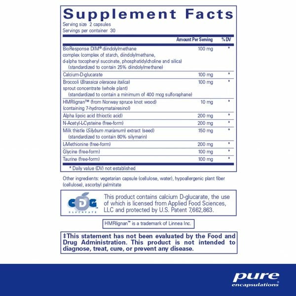 The glucosinolates in broccoli, including indole-3-carbinol and sulforaphane, help support healthy detoxification. BioResponse DIM® provides 25 mg per serving of a highly absorbable form of diindolylmethane, an important metabolite of indole-3-carbinol. These compounds promote healthy estrogen metabolism and cell cycle activity. Calcium-D-glucarate targets beta glucuronidase enzyme activity, promoting healthy hormone detoxification through the glucuronidation pathway. Lignans, such as 7-hydroxymatairesinol (HMR), are converted in the body to enterolactone. Research indicates that dietary intake of lignans and healthy serum enterolactone levels provide support for cellular, heart, breast, bone and cognitive health. Silymarin, alpha lipoic acid and N-acetyl-L-cysteine (NAC) act to support phase II detoxification enzyme activity in the liver and offer antioxidant support for cellular protection. Taurine, glycine and methionine promote phase II detoxification pathways and healthy cell metabolism.