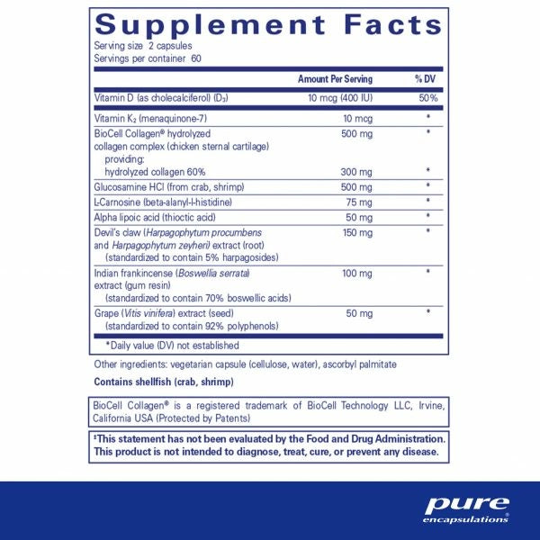 This formula addresses the unique nutritional needs of intervertebral cartilage (IVC). IVC is avascular, wears differently, and is affected by different nutritional factors compared to articular cartilage. The basics of healthy disc composition involve glucosamine, chondroitin and collagen. Glucosamine supports spinal disc integrity and has the potential to support the strength of the disc under compressive loads. In postmenopausal women, the healthy composition of the lumbar spine is directly related to collagen content. This formula may also support healthy advanced glycation end product activity, healthy immune mediator activity and healthy calcium metabolism. Advanced glycation end products may reduce the ability of the intervertebral disc to produce proteoglycans, which comprise healthy disc matrix. The age-related increase in advanced glycation end products also contributes to stiffening of the spine. l-Carnosine, grape seed extract and alpha lipoic acid help to maintain healthy advanced glycation end product metabolism and provide antioxidant protection. Cartilage end plate calcification also affects disc function and longevity. Vitamin K2 as menaquinone-7 also maintains a healthy balance of calcium uptake into extra-skeletal tissues. Devil's claw supports day-to-day spinal comfort and flexibility as demonstrated by German studies, while boswellia offers key support for musculoskeletal comfort.