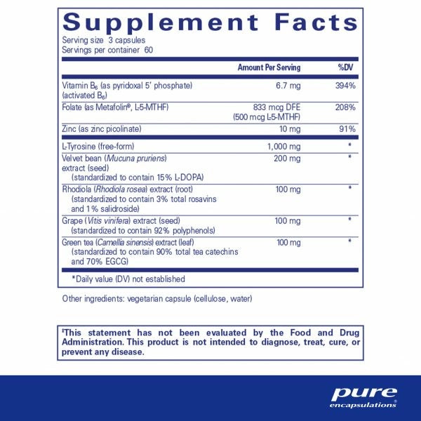 DopaPlus promotes the production of dopamine to support daily cognitive function and performance on mental tasks. This formula provides the dopamine precursors L-tyrosine and L-DOPA (from Mucuna pruriens). In a randomized, controlled, double-blind, crossover trial, Mucuna pruriens supplementation promoted L-DOPA plasma concentrations. The cofactors vitamin B6 , folate (as Metafolin® L-5-MTHF) and zinc support dopamine production. Studies show that supporting optimal serum levels of these nutrients promote positive mood. Rhodiola and green tea polyphenols promote the stability of dopamine and maintain healthy dopamine reuptake. Grape seed proanthocyanidins support cognitive function and mental sharpness. Green tea and grape seed polyphenols help to maintain neuronal health and function.