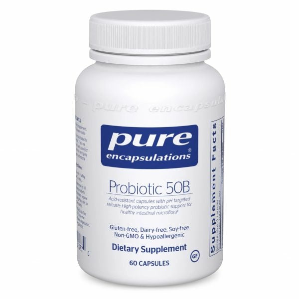 Probiotic 50B offers seven researched probiotic strains that promote healthy intestinal ecology to support gastrointestinal and immune health. Clinical studies indicate that Lactobacilli and Bifidobacteria supplementation supports intestinal epithelial integrity and a healthy immune response.1-3 Lactobacillus rhamnosus GG is one of the most characterized and utilized probiotic strains with numerous clinical trials on immune, GI, and overall health across all ages.