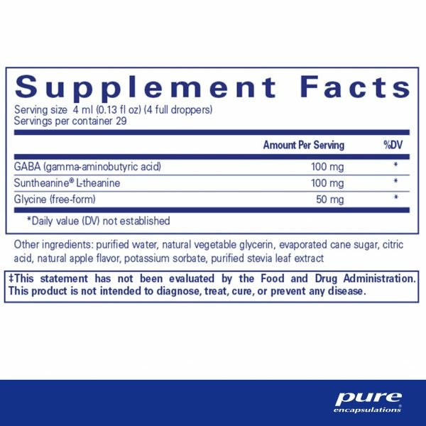 Pure Tranquility liquid offers calming support with the main inhibitory neurotransmitters, GABA and glycine. Both GABA and l-theanine enhance alpha wave production in the brain to promote relaxation and moderate occasional stress. In an open trial, GABA promoted alpha waves and moderated beta waves within 1 hour of administration. Several studies indicate that l-theanine enhances alpha wave production in the occipital and parietal regions of the brain, an indicator of relaxation, without causing drowsiness. Evidence suggests that GABA and l-theanine also maintain healthy IgA levels, potentially supporting immune health during occasional stress.