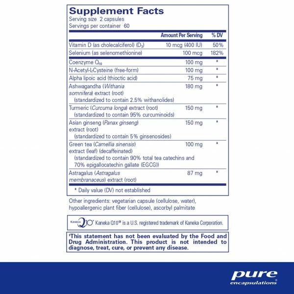 This formula offers antioxidants and adaptogens to maintain cell health and protect healthy tissue. Antioxidant vitamins and minerals promote healthy cell function and cell longevity, as indicated in numerous trials. Adaptogens are recognized for their balancing effects on physiology, encouraging cellular homeostasis. Alpha lipoic acid offers intracellular as well as extracellular antioxidant protection. Coenzyme Q10 moderates superoxide anion, hydrogen peroxide and hydroxyl radicals, maintaining the integrity of cellular membranes. N-acetyl-l-cysteine and selenium help to replenish glutathione, scavenge free radicals and maintain healthy liver function. Curcumin supports healthy cyclooxygenase enzyme activity. Vitamin D and green tea have been studied for their potential to maintain healthy angiogenesis balance and cellular growth and differentiation. Astragalus supports macrophage, natural killer cell and T-cell activity. Ashwagandha and Panax ginseng promote healthy cell signaling and gene expression.