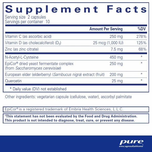 Natural killer cells are part of the body's innate, or first-line, immune response. They respond more quickly than the adaptive immune system comprised of B cells and T cells. Once activated, natural killer cell activity peaks in as quickly as several hours, providing rapid support and wide-range immune defense. EpiCor® is a fermentate of Saccharomyces cerevisiae containing various bioactive metabolites. These nutrient metabolites are produced in a specialized fermentation process and enhance immune cell production. In one cellular study, EpiCor® promoted natural killer cell activation, as well as that of B cells and T cells. In two randomized, double-blind, placebo-controlled trials, EpiCor® provided statistically significant support for upper respiratory tract health and overall immune health. A separate open label, in-house trial indicated a strong potential for EpiCor® supplementation to enhance secretory IgA levels after 30 days. These various actions demonstrate the ability of EpiCor® to address both innate and adaptive immune responses. NAC (n-acetyl-l-cysteine) promotes endogenous glutathione production for antioxidant protection and provides lung defense mechanisms for healthy respiratory function. In a randomized, double-blind trial involving mostly older individuals, NAC showed support for respiratory health. Quercetin and elderberry provide flavonoids that offer additional support for immune and respiratory function while vitamin C, vitamin D and zinc play important roles in immune cell activation.