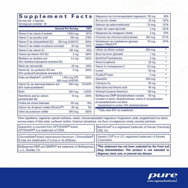 PureGenomics® UltraMultivitamin is designed to support optimal health with a comprehensive profile of bioavailable vitamins, chelated minerals and antioxidants. Specifically, it includes activated B vitamins and choline to support healthy methylation, which plays many essential roles including neurotransmission, vitamin assimilation, DNA synthesis and gene regulation. These processes maintain cardiovascular function, cognition, emotional wellness and cellular protection. Vitamin D supports healthy VDR activity. Additional cellular protection support is offered with the antioxidants alpha lipoic acid and CoQ10, as well as N-acetyl-L-cysteine to support endogenous glutathione production. Genetic variations in the SLC23A1 gene are associated with absorption of vitamin C. Folate is offered in this formula as Metafolin® 5-methyltetrahydrofolate (L-5-MTHF), the universally metabolized and biologically active form of folate, providing support for individuals with genetic variations in the MTHFR gene. Variations in MTHFD1 and PEMT, two genes involved in methylation, have been associated with increased choline needs. Vitamin B12 is offered as adenosylcobalamin, the active mitochondrial form, and hydroxycobalamin, a precursor of both methylcobalamin and adenosylcobalamin. Magnesium is provided in an innovative microencapsulation form to enhance absorption. Magnesium and lithium may help support cognitive function and emotional balance in some individuals. Preformed vitamin A, together with a blend of lutein and zeaxanthin, promote macular health for individuals with genetic variations in the enzyme BCMO1, which can decrease the conversion efficacy of carotenoids into retinal by up to 69%. Enhanced-absorption diindolylmethane is also included to support healthy estrogen metabolism.
