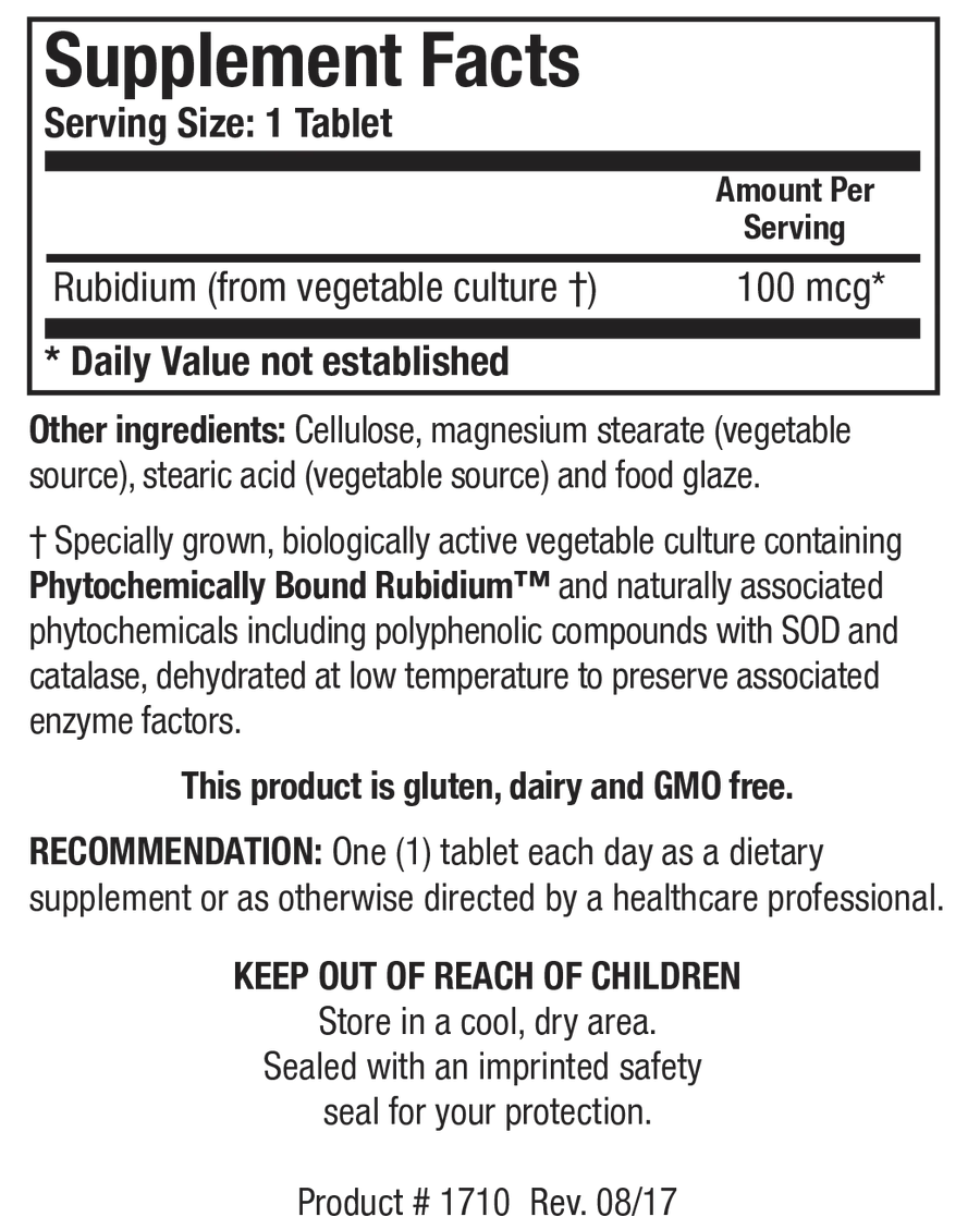 †Specially grown, biologically active vegetable culture containing Phytochemically Bound Rubidium™ and naturally associated phytochemicals including polyphenolic compounds with SOD and catalase, dehydrated at low temperature to preserve associated enzyme factors.