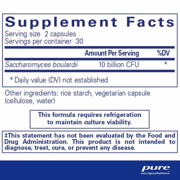- Saccharomyces boulardii is a member of the Saccharomyces cerevisiae family. It is grown on a medium of molasses, vitamins and minerals. A gentle "fluid bed" process is used to dry, cool and sterilize the product, allowing for efficient processing without product degradation. Pure Encapsulations probiotic products contain a unique form of rice starch produced through a natural enzymatic process. This proprietary starch has been extensively tested and is added to protect the viability of the probiotic organisms.