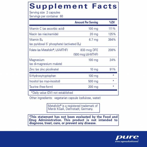 SeroPlus promotes serotonin synthesis to support relaxation, moderate occasional stress and maintain healthy eating behavior. This formula provides the serotonin precursor, 5-HTP, and inositol, which supports healthy sensitization of serotonin receptors. Taurine also supports healthy serotonin activity, potentially by maintaining healthy reuptake. Niacinamide and zinc enhance 5-HTP availability. This formula includes the cofactors magnesium, vitamin C, vitamin B6 and Metafolin® L-5-MTHF to support serotonin production and positive mood. In a randomized, controlled trial involving elderly individuals, magnesium offered statistically significant support for positive mood. In another double-blind, randomized and placebo-controlled trial involving young women, zinc supplementation offered statistically significant support for positive mood.