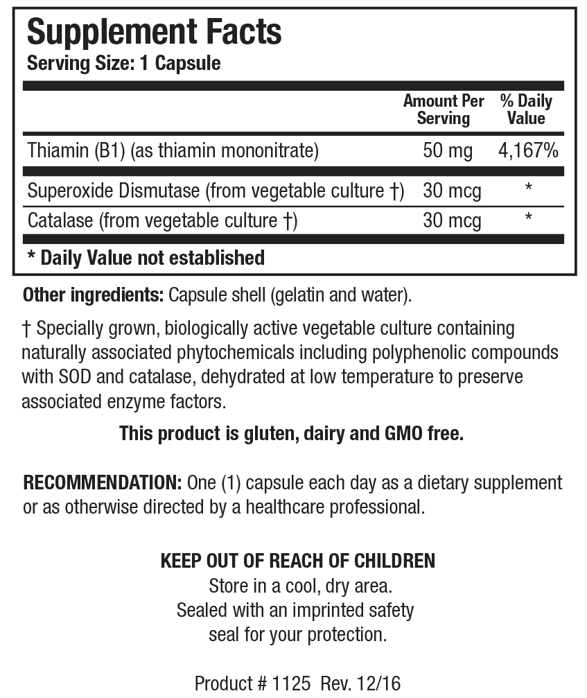 Thiamin (B1) (as thiamin mononitrate), Superoxide Dismutase (from vegetable culture†), Catalase (from vegetable culture†).