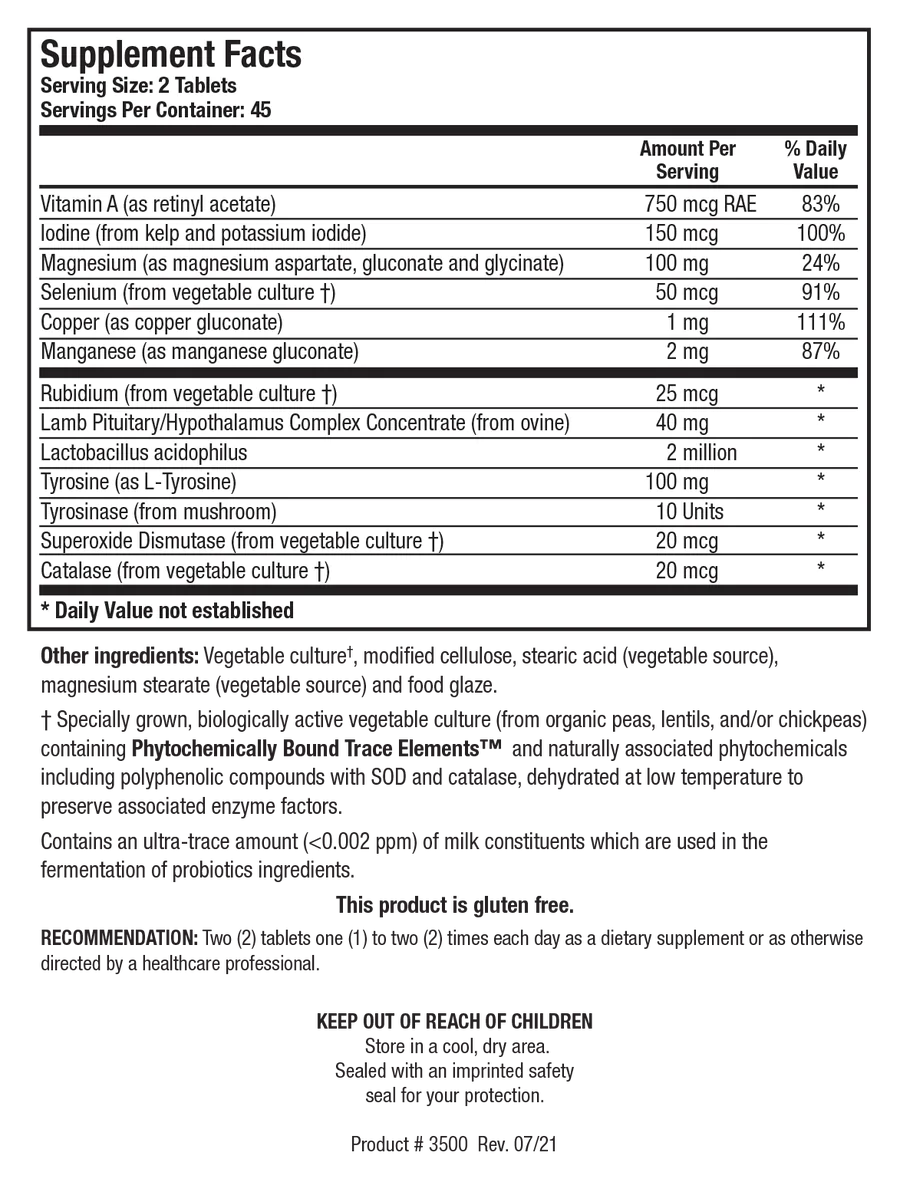 Vitamin A (as retinyl palmitate), Iodine (from kelp), Magnesium (as magnesium aspartate, gluconate and glycinate), Selenium (from vegetable culture†), Copper (as copper gluconate), Manganese (as manganese gluconate), Rubidium (from vegetable culture†), Lamb Pituitary/Hypothalamus Complex Concentrate (from ovine), Lactobacillus acidophilus (DDS-1), Tyrosine (as L-Tyrosine), Tyrosinase (from mushroom), Superoxide Dismutase (from vegetable culture†), Catalase (from vegetable culture†).