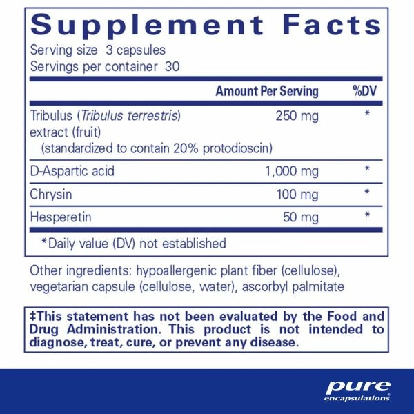 Contains D-aspartic acid and European-sourced Tribulus terrestris to support testosterone balance. Maintains healthy aromatase enzyme activity with the flavonoids chrysin and hesperetin.
