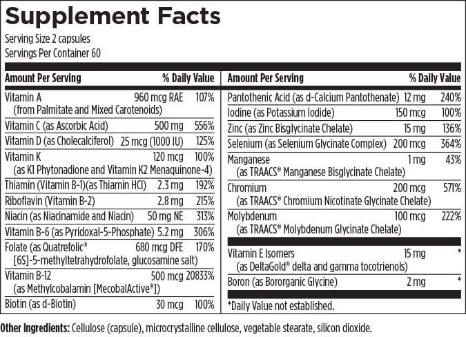 Twice Daily Multi™ contains optimal amounts of many nutrients not easily obtained in most diets. It uses higher quality ingredients than most multivitamins, including vitamin E Isomers as DeltaGold® tocotrienols, a highly bioavailable form of folate, and true amino acid chelate minerals for optimal tolerance and absorption. These exceptional ingredients are combined in an up-to-date, science-based formulation to create a truly superior multivitamin.