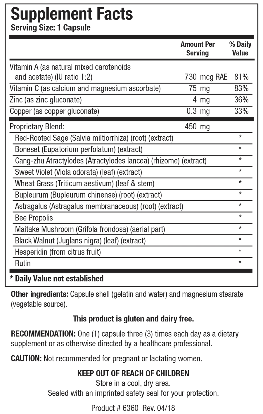 Vitamin A (as natural mixed carotenoids and palmitate) (IU ratio 1:2), Vitamin C (as calcium and magnesium ascorbate), Zinc (as zinc gluconate), Copper (as copper gluconate), Red-Rooted Sage (Salvia miltiorrhiza) (root) (extract), Boneset (Eupatorium perfolatum) (extract), Cang-zhu Atractylodes (Atractylodes lancea) (rhizome) (extract), Sweet Violet (Viola odorata) (leaf) (extract), Wheat Grass (Triticum aestivum) (leaf & stem), Bupleurum (Bupleurum chinense) (root) (extract), Astragalus (Astragalus membranaceous) (root) (extract), Bee Propolis, Maitake Mushroom (Grifola frondosa) (aerial part), Black Walnut (Juglans nigra) (leaf) (extract), Hesperidin (from citrus fruit), Rutin.