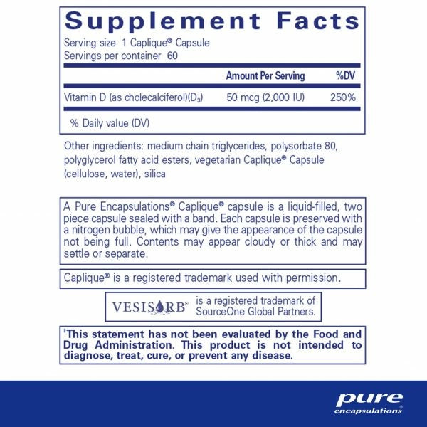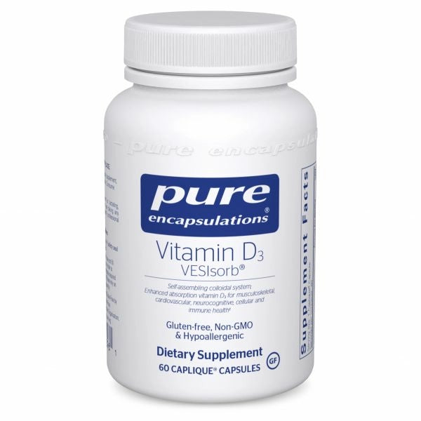 VESIsorb®, a patented advanced delivery system for improving nutrient bioavailability, offers enhanced-absorption of lipid soluble bioactives by promoting their dissolution in an aqueous environment. Vitamin D promotes intestinal calcium and phosphorous absorption and reduces urinary calcium loss, essential mechanisms for maintaining proper calcium levels in the body and for healthy bone composition. Research indicates that it also promotes cellular health, including support for breast and prostate tissue, in part by helping to maintain healthy blood vessel function, supporting immune cell activity, and maintaining healthy cell metabolism. A role for vitamin D in supporting colon health by promoting healthy cellular function has also been suggested. Vitamin D's role in immune health has long been established; vitamin D receptors are found in a number of immune cells, including lymphocytes and macrophages, supporting healthy immune cell activation. Vitamin D also supports cardiovascular function in some individuals.